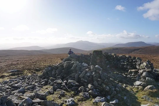 Assuming the river can be crossed, with or without dry feet, 1.5km of pathless, rough ground follows to gain the foot of the NE ridge of Arenig Fach and a view of Llyn Arenig Fach. This section is a little less arduous than might be expected as deep heather is mostly avoidable and there is even the occasional sheep track heading fortuitously in the right direction. Sprits rise at the start of the steep ridge as a path appears beside the fence. However, it soon vanishes and an exhausting, struggle up steep heather and tussocks of vegetation is required to gain the summit of Arenig Fach. The top sports a Bronze Age funerary cairn (Carnedd y Bachgen) along with a wind shelter, large cairn and trig point.