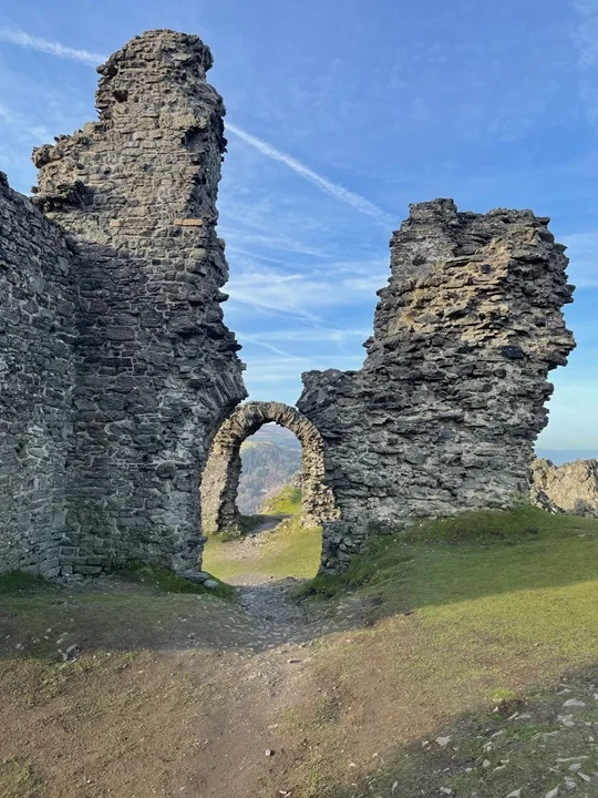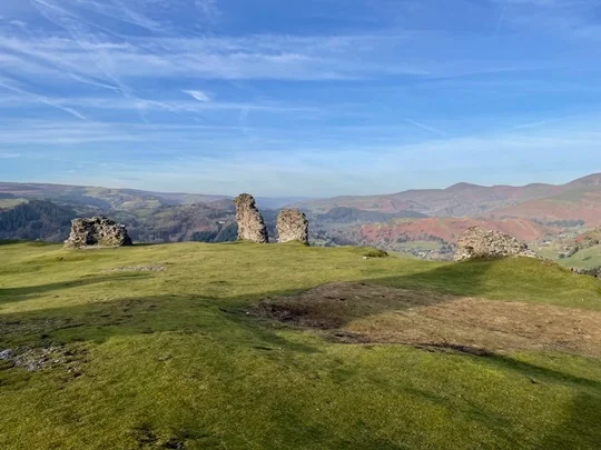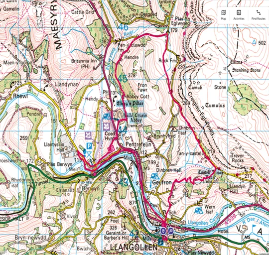 This is a classic North Wales walk with plenty of scenic variety and considerable historical sites. The walk begins at the Mill Street car park (on the north side of the Llangollen Bridge) and follows a public footpath uphill to Castell Dinas Bran. The final steep section of the path leads to the scant remains of the 13th century castle established by the princes of Powys. We join the Offa’s Dyke Path for c. 2km and then return downhill crossing stiles, fields and along some footpaths to a footbridge over the River Eglyyseg and then reach the Valle Crucis Abbey.