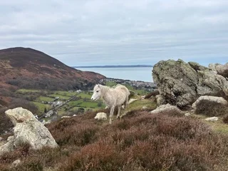 From the second car park on the Sychnant Pass, we traverse across the mountainside to join the North Wales Path passing numerous stone circles, cambered cairns and a ruined hillfort to reach the Druids’ Circle. There are 10 standing stones four of which are > 6 ft tall. On a clear day, there are fantastic views across the Conwy Bay to Puffin Island and Anglesey.